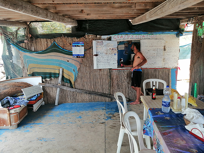 Dopo una giornata in una delle più belle e selvagge rade di Vulcano ci spostiamo per passare la notte nella zona sud/ovest di Lipari, li abbiamo individuato una baia perfetta per ripararci dal grecale e con fondali sabbiosi, ottimi tenitori per la nostra fidata fob. Una volta completato l’ancoraggio ci è saltata subito alla vista la costruzione che si ergeva sul lato destro della spiaggia, subito sotto la ripida parete rocciosa, armonicamente integrata con il paesaggio dell’isola e chiaramente di fattura artigianale. Finiamo di sistemare la barca, caliamo il tender e partiamo subito in direzione della spiaggia. Appena tocchiamo terra vediamo un uomo sulla 50ina uscire dalla costruzione, vestito con un paio di pantaloncini e una maglietta strappati in vari punti, che ci sorride e in maniera brusca ci fa cenno di entrare.